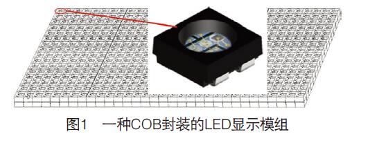 圖1是基于COB封裝技術(shù)的高集成化LED顯示模組。由電路基板(PCB)、設(shè)置在PCB背面的驅(qū)動芯片電路和陣列引腳(球柵或柱),以及設(shè)置在PCB正面的LED燈模組組成。模組中的每個LED單體包括3顆燈芯、4個引腳以及1個正很(或負(fù)很,共負(fù)很結(jié)構(gòu)),每顆RGB發(fā)光晶片通過金線與對應(yīng)的RGB引腳相連,正很通過金線與引腳相連。